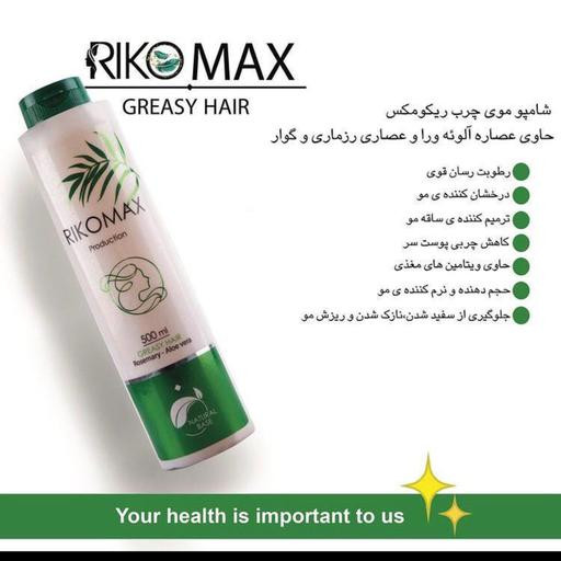 شامپو مخصوص موهای چرب ريکو مکس Riko max به دلیل داشتن ترکیباتی همچون ویتامین B5 و عصاره کراتین موها را تقویت کرده و چربی مو و پوست سر را کنترل می کند. این محصول به موها حجم می دهد و مانع از بروز التهاب و شوره کف سر می شود. این شامپو برای موهای چرب مناسب بوده ضد الکتریسیته ساکن است.