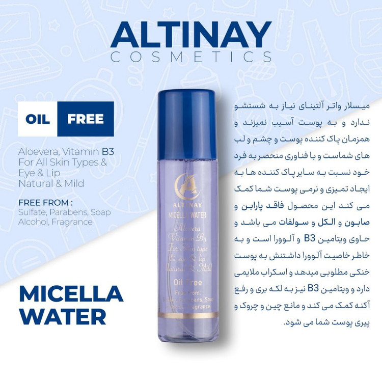 میسلار واتر التینای نیاز به شستشو ندارد و به پوست اسیب نمی رساند همزمان قابل استفاده برای پوست چشم و لب می باشد نسبت به سایر پاک کننده ها نرمی و لطافت خاصی به پوست میدهد و ایجاد حساسیت نمی کند و همچنین به رفع لکه و اکنه بسیار کمک می کند و مانع پیری و چین و چروک پوست میشود