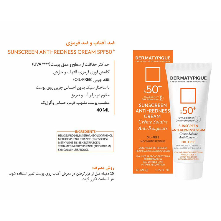 کرم ضد آفتاب ضد لک +SPF50 درماتیپیک با استفاده از فیلتر های نوآورانه، از پوست در برابر طیف وسیعی از اشعههای مضر خورشید محافظت کرده و ضد قرمزی و ضد حساسیتزا و هایپوآلرژیک بوده و از قرمز شدن پوست نیز جلوگیری میکند.